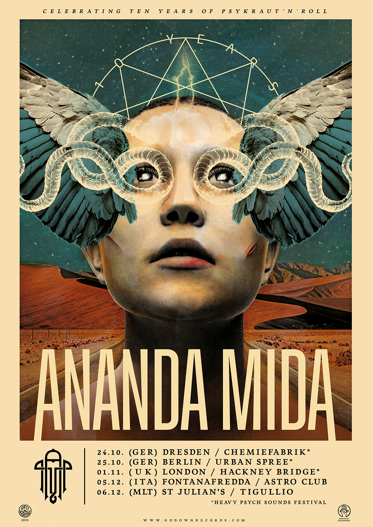 Original design for Ananda Mida´s "Ten Years" anniversary tour. The design is based on the cover artwork of "Reconciler", the final chapter of their trilogy albums.